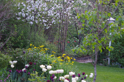 Ärhäkkä kevätlenssu takana ja kas kevät on vaihtumassa kesäksi. Narsissit ovat lopettelemassa kukintaansa, mutta myöhäisemmät tulppaanit ovat nyt parhaimmillaan. Uskollinen piparmintunraikas Carnaval de Nice uusii joka vuosi, vaikka alunperin ajattelinkin sen vain yhden kesän ilostuttajaksi. Ja sitten se liikuttava liljakukkainen pariskunta, joka ilmestyi taas. Viime vuonna olivat vielä samanpituiset, nyt selvästi toinen tukeutuu toiseen:-) Pioneista ensimmäisenä kukkaan ehti matalahko pallaksenpioni. Harmi vaan, että nyt on niin lämmintä, että kukinta on lyhyt ja ytimekäs, mutta toki vaikuttava. Arvoisessaan seurassa hänellä kerrannaiskukkaisia Angelique-tulppaneita ja pitkiä White Emperor -liljatulppaneita.